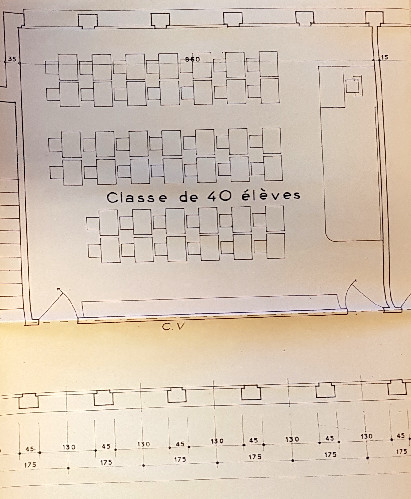 Plan d'une salle de 40 élèves dans un externat. Elle est desservie par un couloir latéral. Elle occupe 5 travées de la trame de 1,75m imposée par le ministère. Détail du plan d'un bâtiment d'externat (G. Tourry, architecte, 10/02/1954)Immatriculation