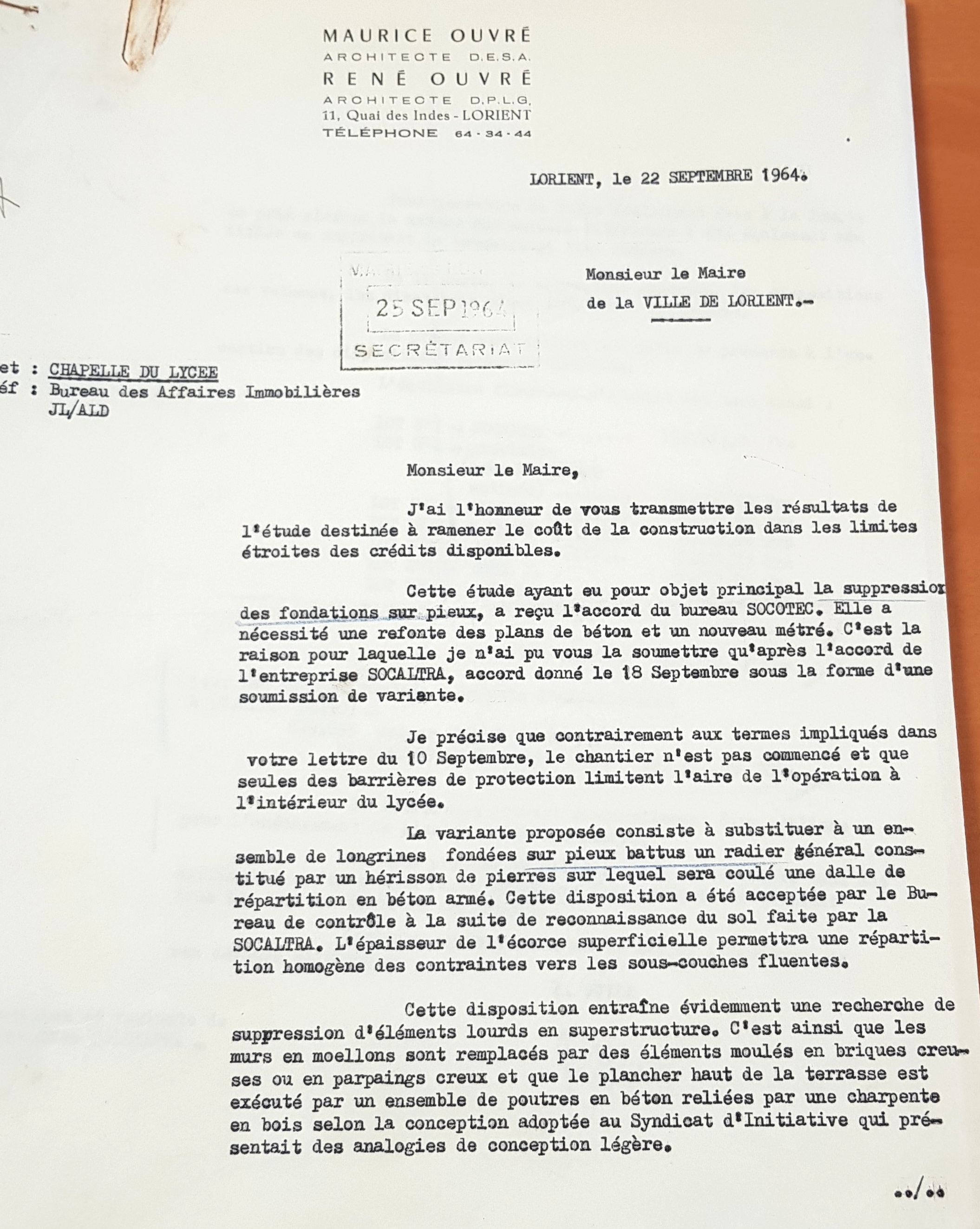 Lettre de René Ouvré, architecte, au maire de Lorient le 22/09/1964, à propos de la révision du projet de chapelle (recto).Immatriculation