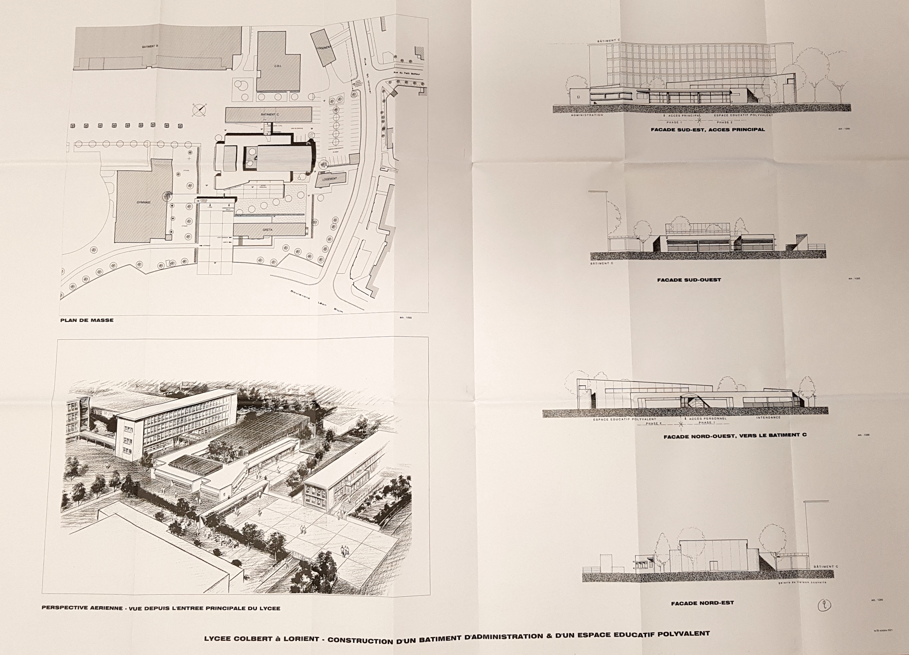 Plan, perspective aérienne, élévations des façades du bâtiment d'administration et d'un espace éducatif polyvalent SN SD (AM_Lorient_1553W1). Ces bâtiments ont été construits en 2004 selon les plans de Marc Andréatta et Jean-François Gallienne.Immatriculation