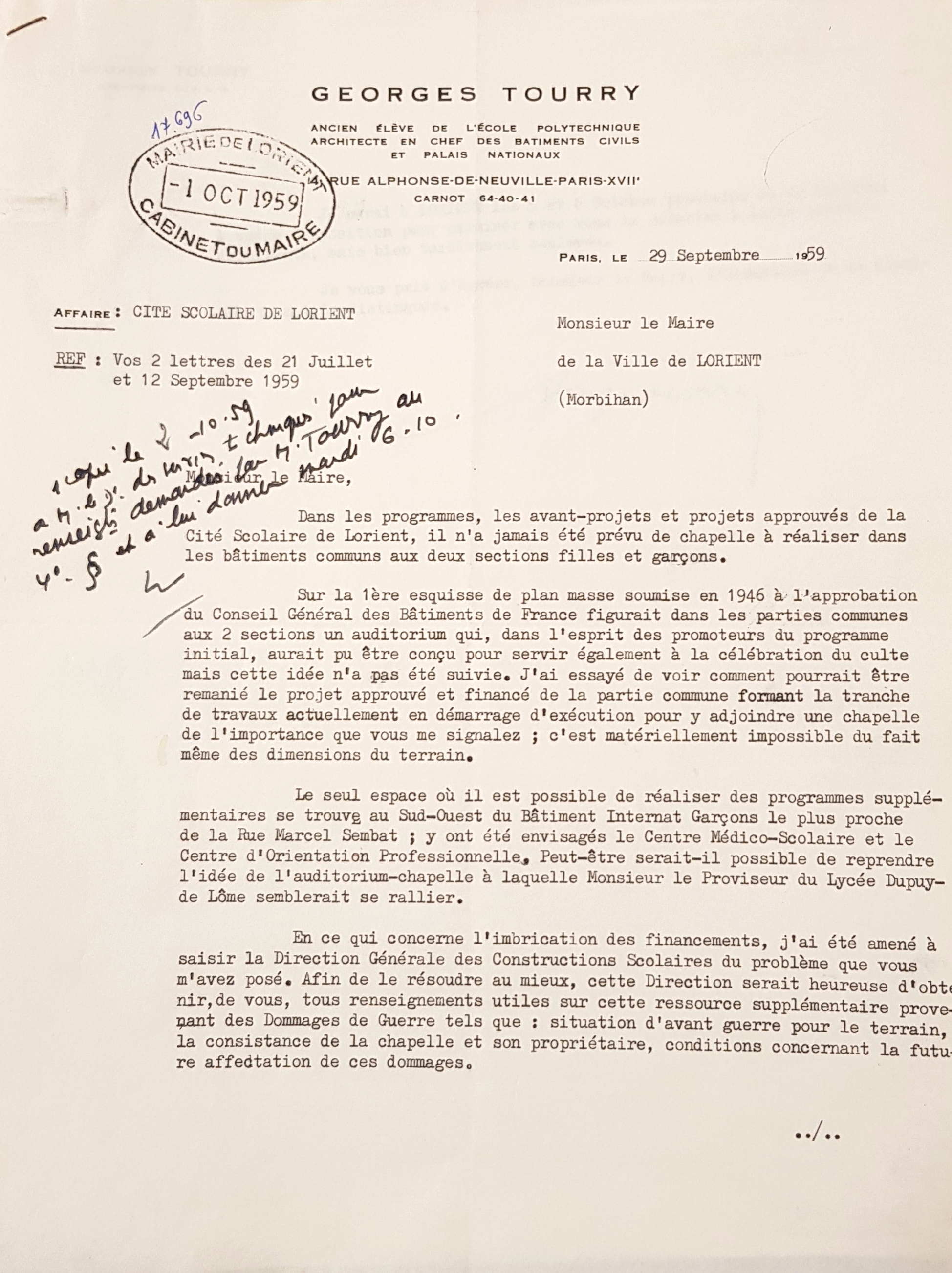 Lettre de Georges Tourry au maire de Lorient, 29/09/1959, à propos de la chapelle (recto).Immatriculation
