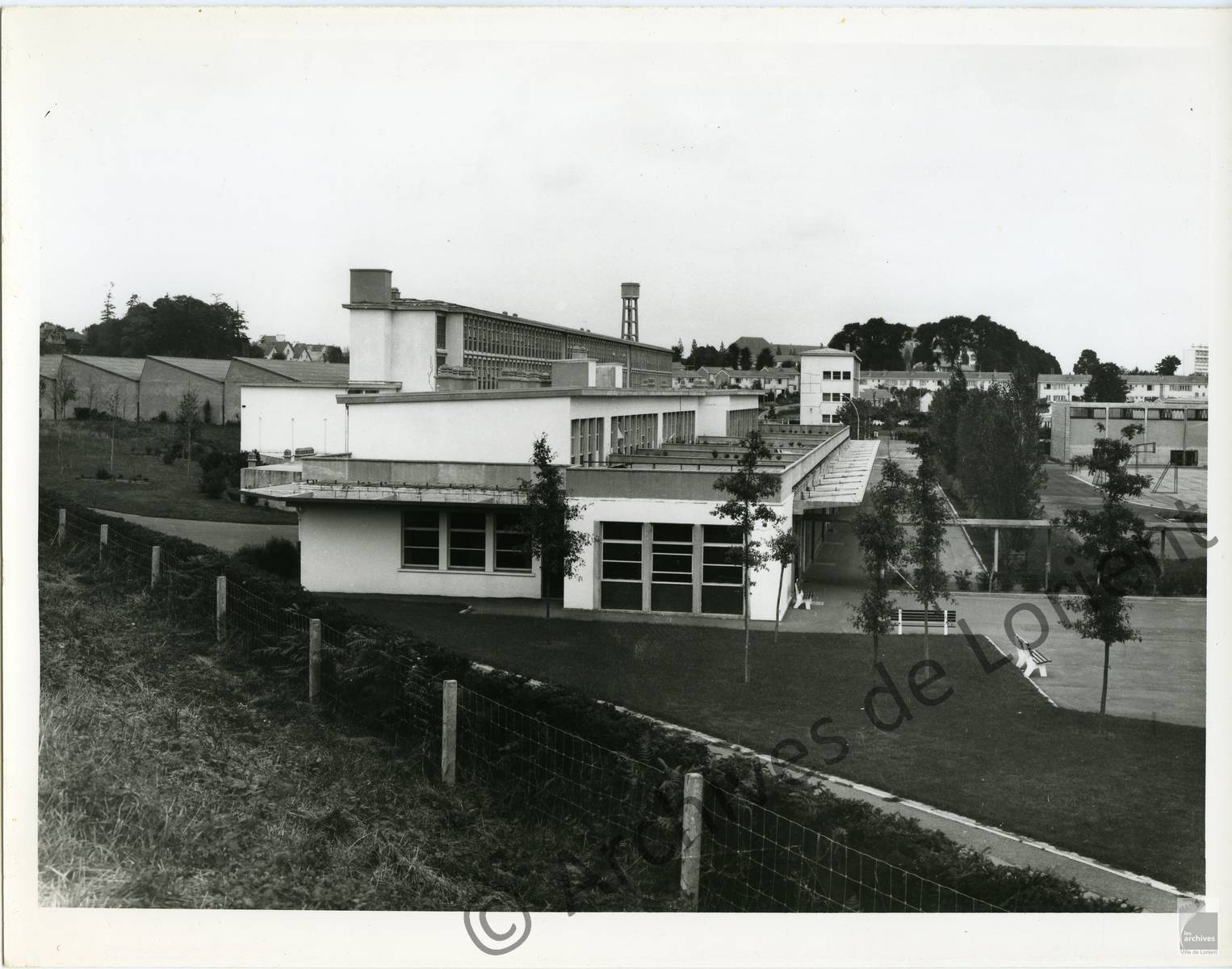 Vue d'ensemble : au premier plan, la restauration scolaire avec des logements de fonction en attique, à l'arrière plan, de gauche à droite : les ateliers, le bâtiment B, le bâtiment C et le gymnase.Immatriculation