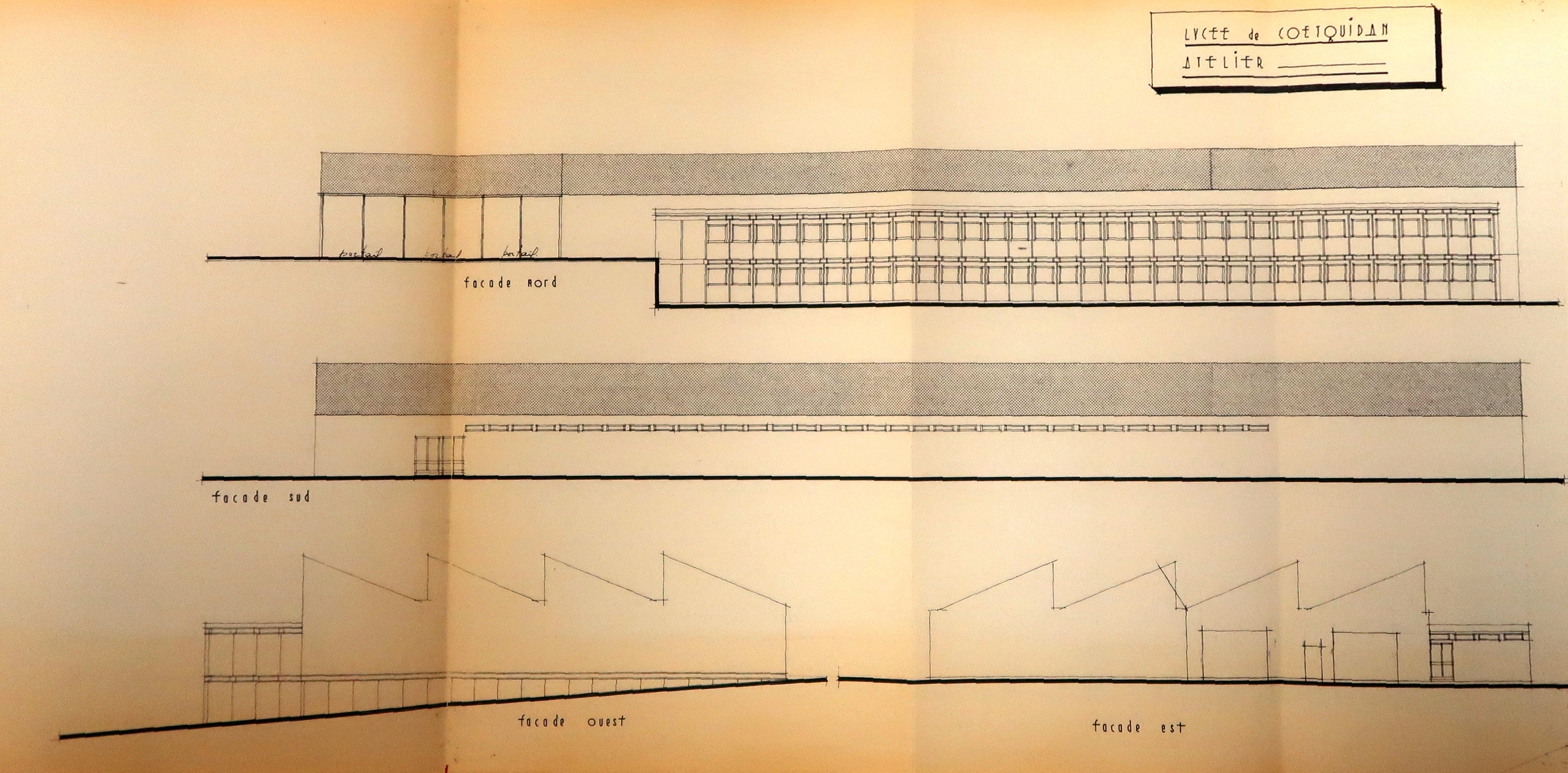 Document figuré issu d'un fonds non classé sur la construction du lycée, conservé dans les archives de l'établissement, comprenant des plans, élévations et coupes dont certains sont datés et signés de l'équipe d'architectes sous la direction de Georges Massé, d'autres, réunis dans un cahier A3, ne le sont pas.