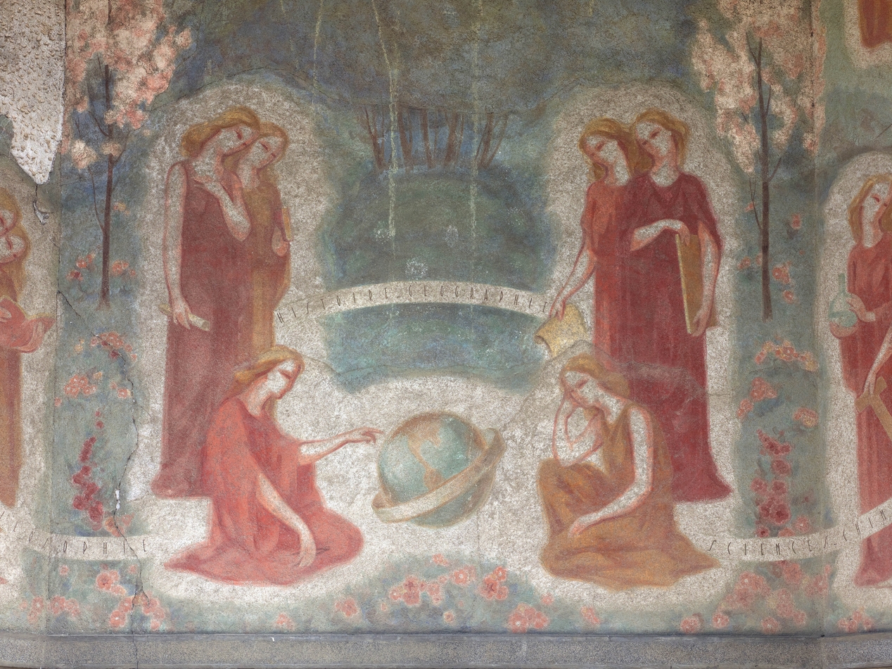 Peinture murale de Théophile Lemonnier sous la rotonde : "Poésie - Lettres - Philosophie - Histoire - Géographie - Sciences - Chimie - Physique - Arts" : détail.Immatriculation