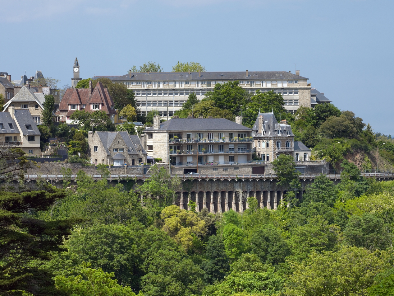 Dans un cadre urbain et naturel exceptionnel, la façade sud-ouest du bâtiment D, prise depuis un pont urbain, sur la vallée du Gouédic.Immatriculation