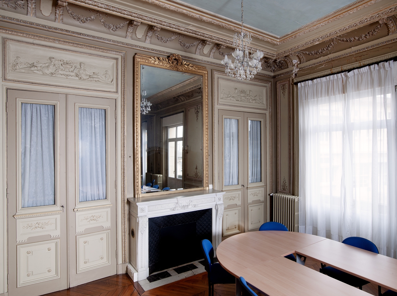 Salon d'honneur de la Villa Baratoux (actuellement salle du conseil d'administration du lycée) : détail sur la décoration d'un mur latéral.Immatriculation