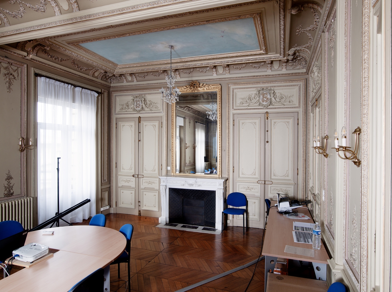 Salon d'honneur de la Villa Baratoux (actuellement salle du conseil d'administration du lycée) : vue partielle. Noter la décoration d'un mur latéral et sur d'un caisson du plafond.Immatriculation