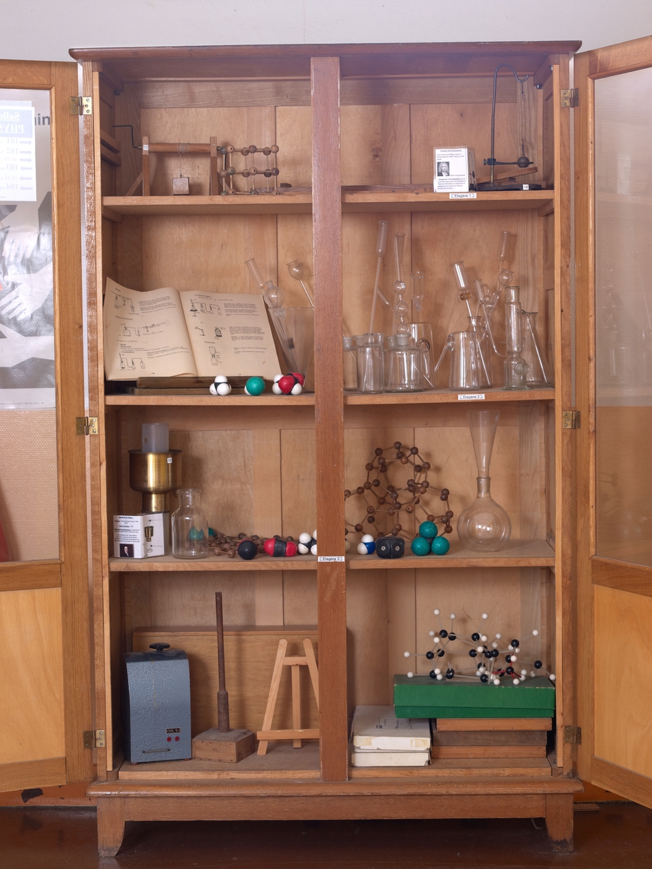 Vue d'ensemble d'une des vitrines de la collection de physique et de chimieImmatriculation