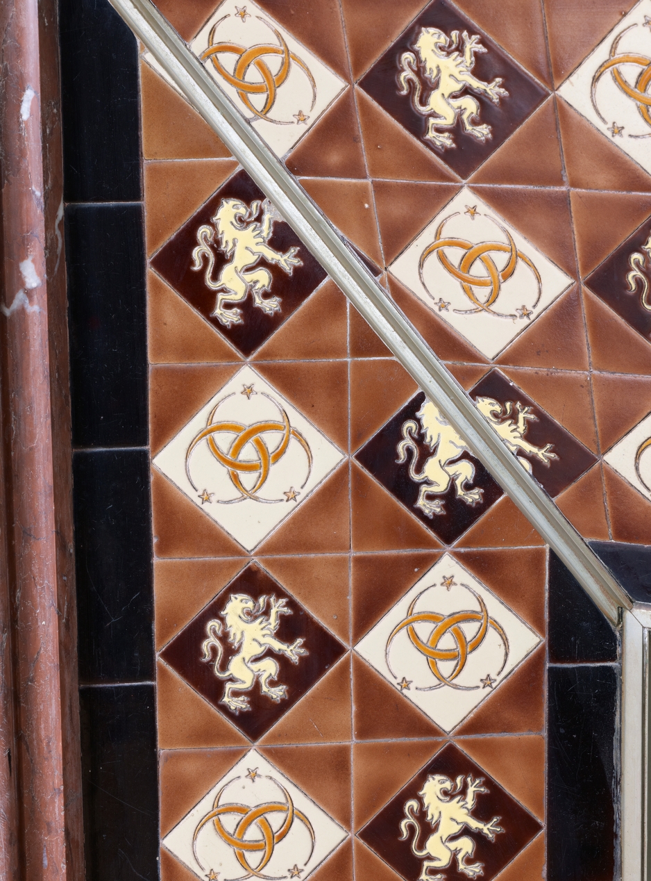 Bureau du proviseur dans la Villa Baratoux : détail sur la décoration de la cheminée, le Griffon, symbole de Saint-Brieuc, et un motif de trois cercles enlacés.Immatriculation
