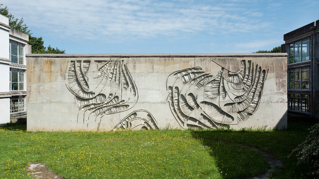 Décoration du pignon sud du gymnase, réalisée par empreinte de polystyrène traité (Bernard Alleaume et Yvette Vincent-Alleaume).