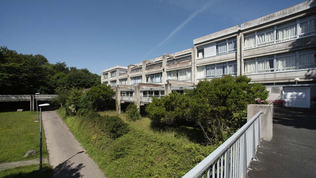 Façade sud de l'internat et son portique décoratif en béton.