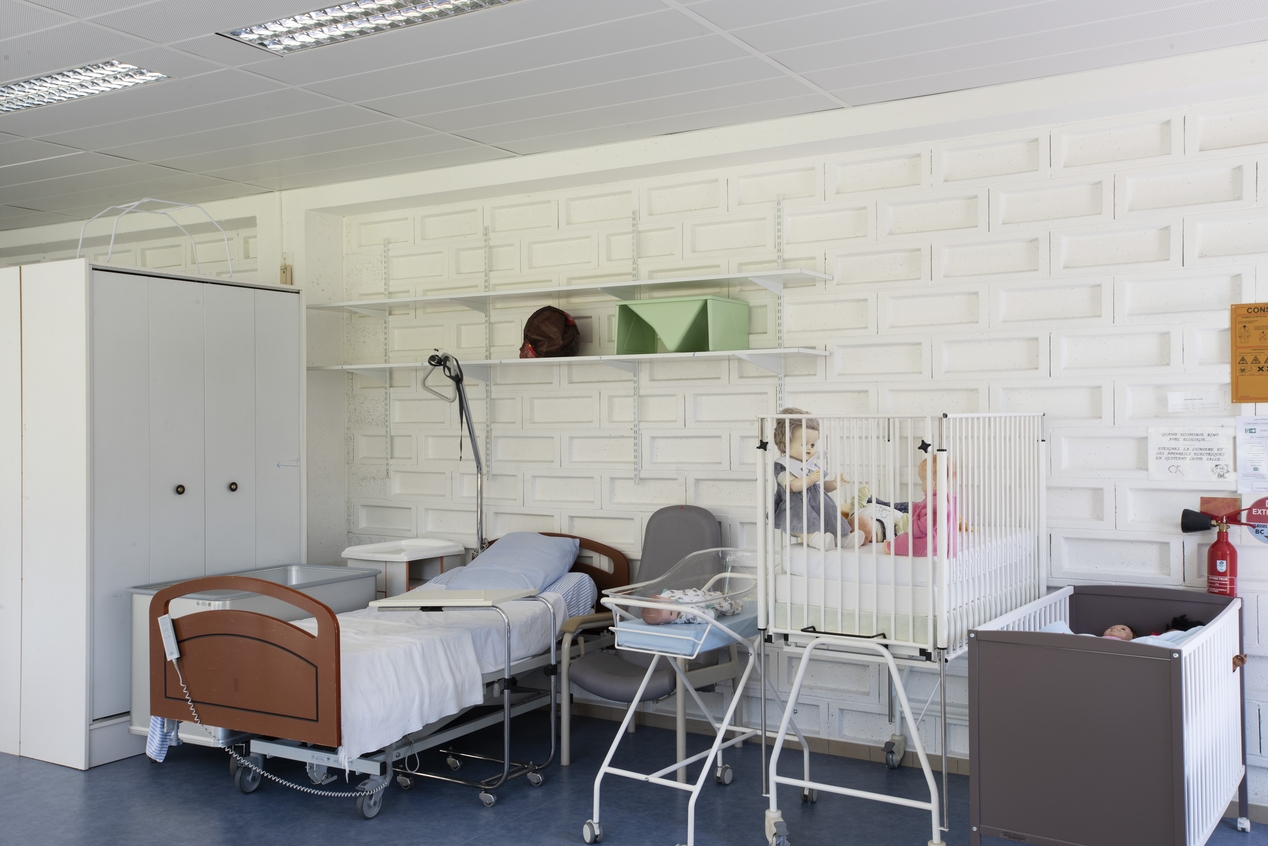 Atelier. Noter la cloison en parpaing de ciment dont la forme joue un rôle acoustique.Immatriculation