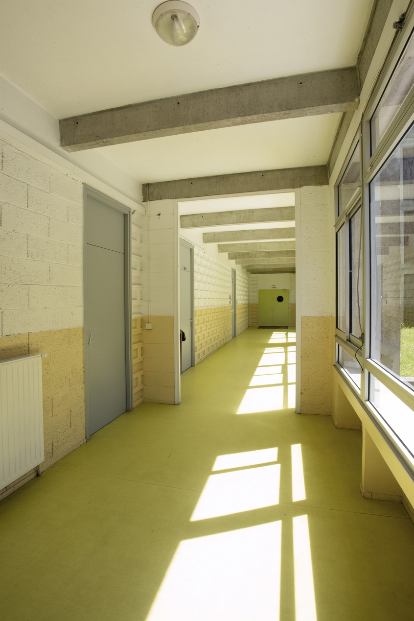 Un couloir latéral de l'aile ouest de l'externat : béton, ciment et verre.Immatriculation