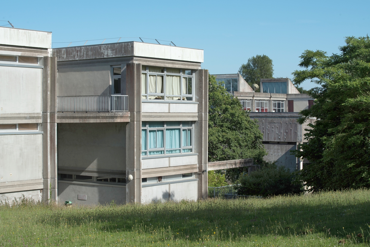 Vue d'ensemble : internat angle sud-ouest ; passerelle au-dessus du talweg ; gymnase, façade nord et à l'arrière plan, aile est de l'externat, et les verrières éclairant, à l'origine, des salles de dessin.Immatriculation