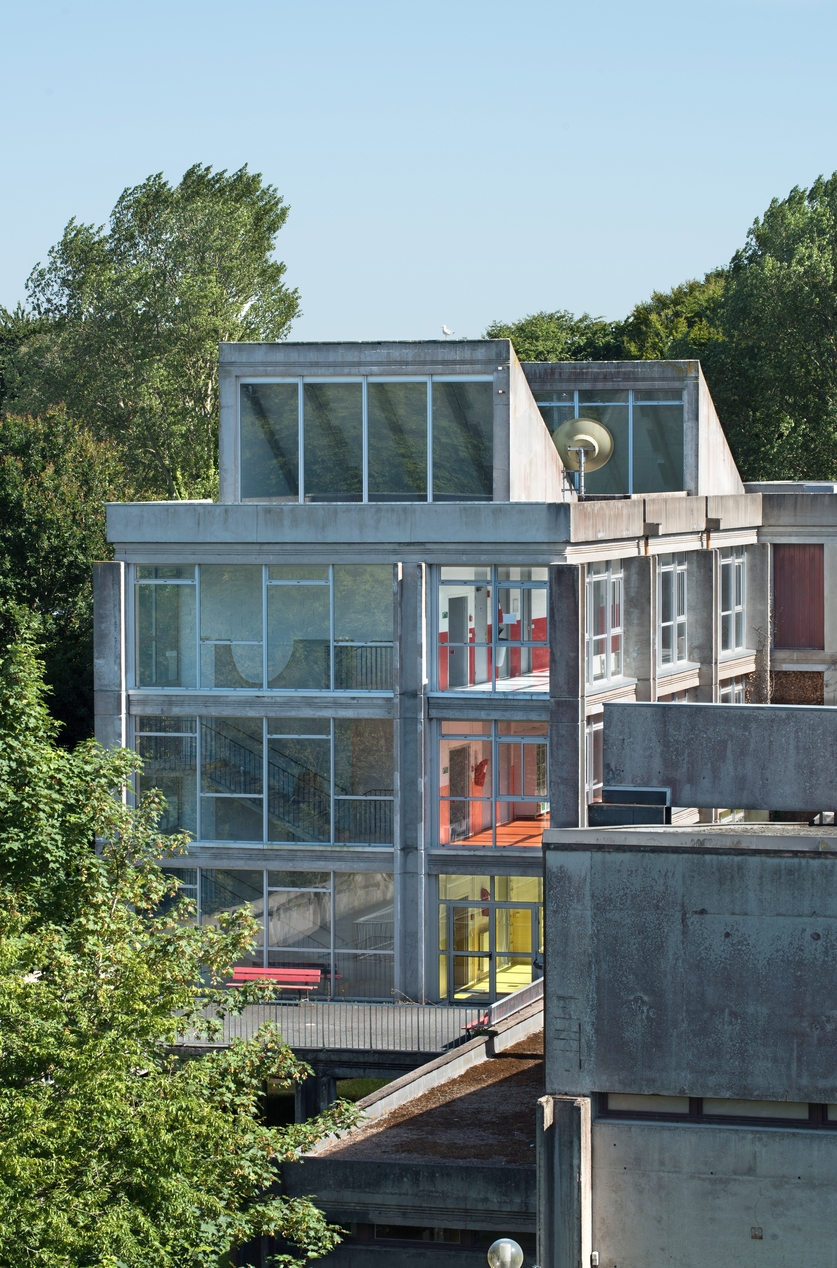Aile est de l'externat, prise depuis les toits de l'internat, au nord : la transparence permet d’apercevoir le dessin de l'escalier. Les verrières éclairaient à l'origine des salles de dessin : elles ne remplissent plus leur rôle depuis l'installation de faux plafonds.Immatriculation