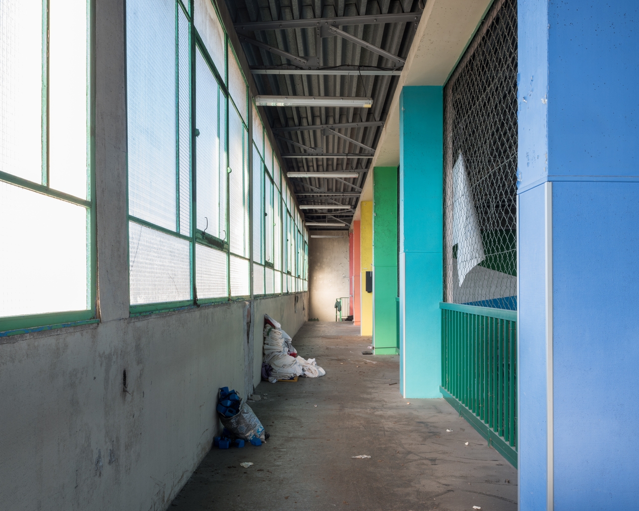 Tribunes du gymnase avec garde-corps et grillage sur toute la hauteur. Jean de Jaegher et François Roussseau, architectes, 1968.Immatriculation