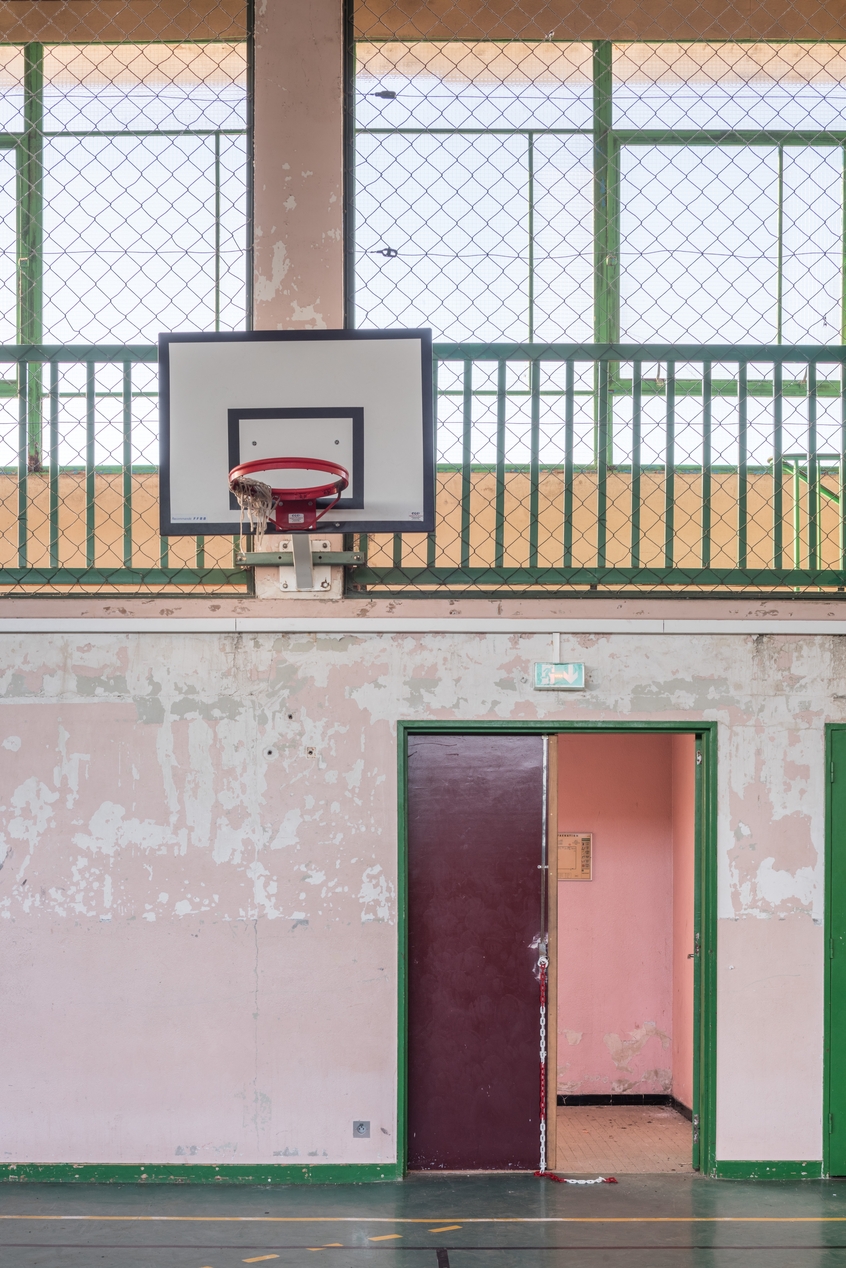 Vue intérieure latérale : détail. Jean de Jaegher et François Roussseau, architectes, 1968. Panier de basket-ball, tribunes et accès aux vestiaires.Immatriculation