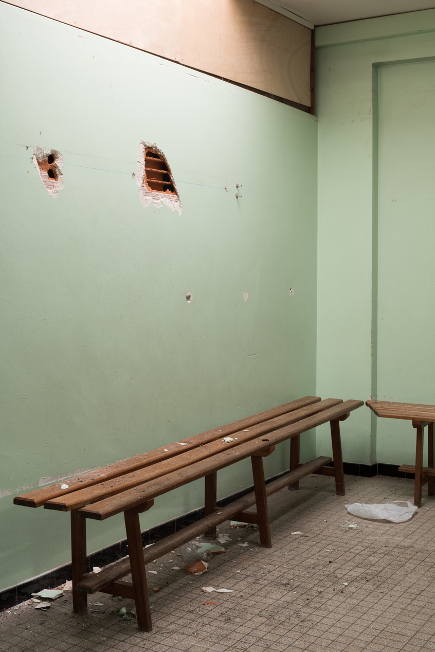 Vestiaire : vue intérieure. Le mobilier semble d'époque.Immatriculation