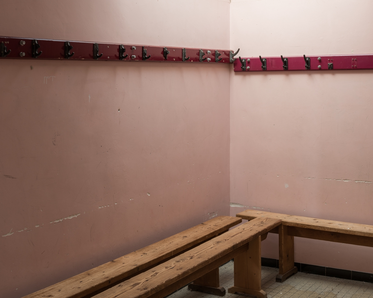 Vestiaire, vue intérieure. Bancs et porte-manteaux.Immatriculation
