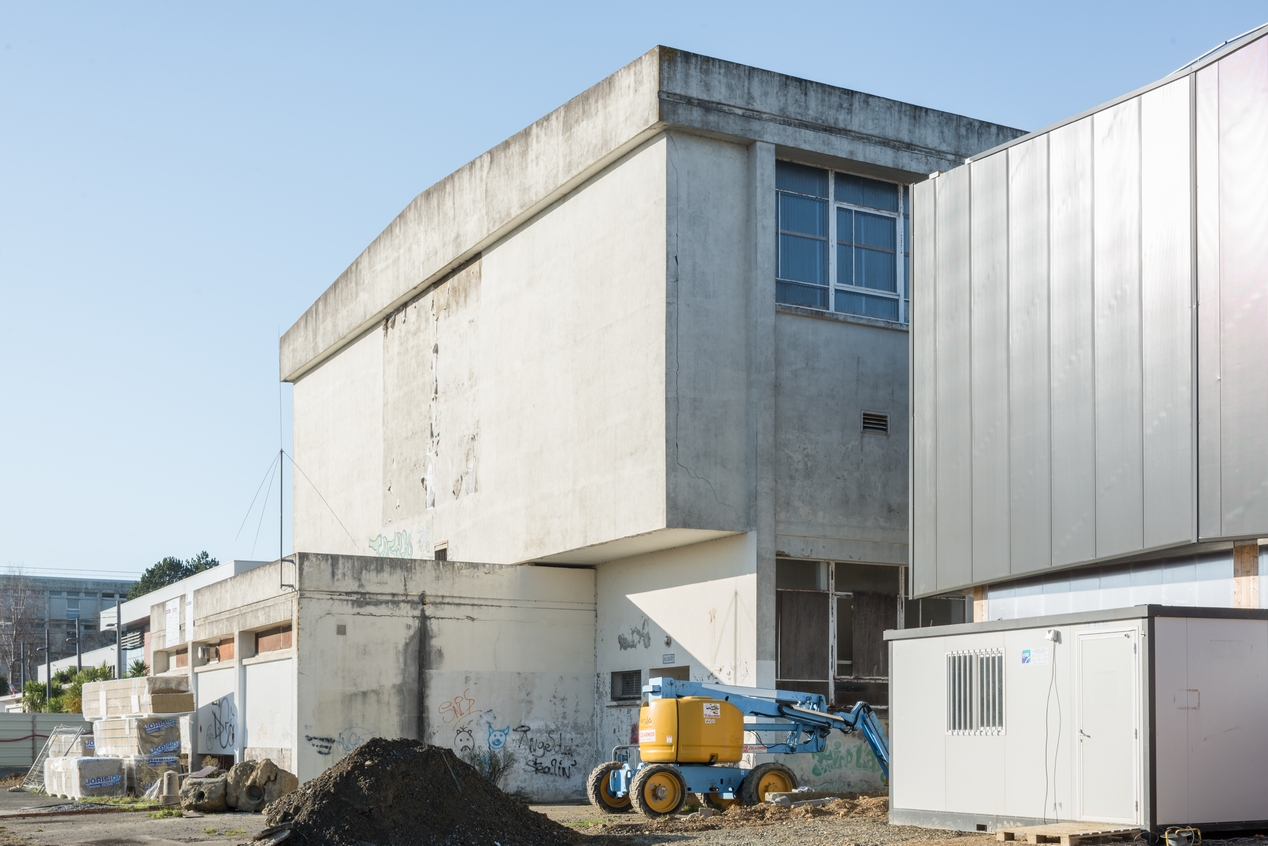 Façade sud, vue d'ensemble (Jean de Jaegher et François Roussseau, architectes, 1968) et détail de la façade sud du nouveau gymnase, en cours de construction, à l'est du gymnase-piscine, voué à être détruit.Immatriculation