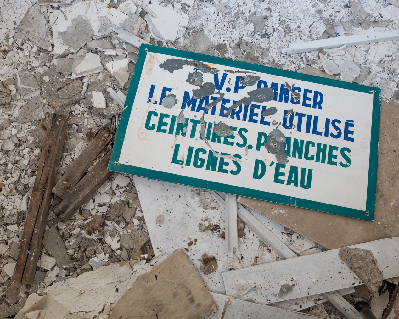Gravats et pancarte à l'intérieur du bassin désaffecté, en 2019.Immatriculation