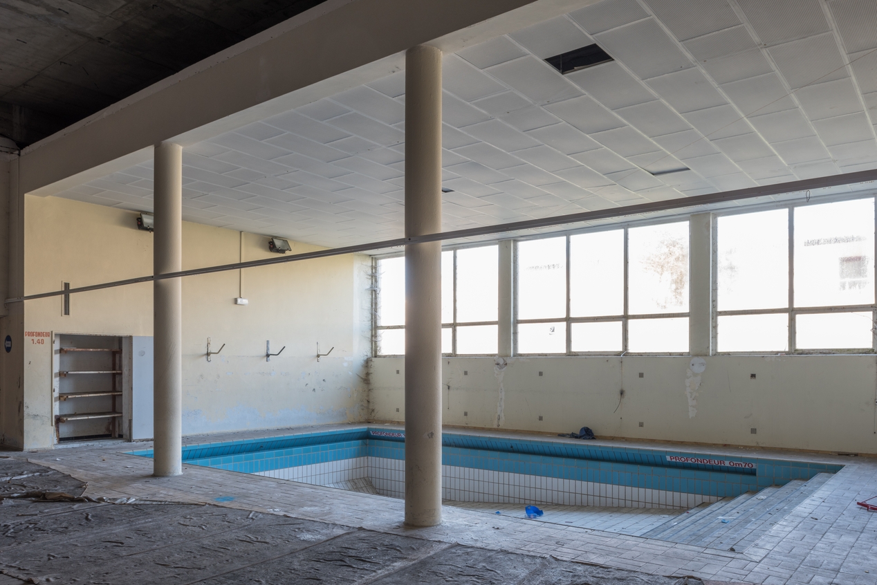 Vue d'ensemble du petit bassin (0,7 à 1,40 m de profondeur). Jean de Jaegher et François Roussseau, architectes, 1968.Immatriculation