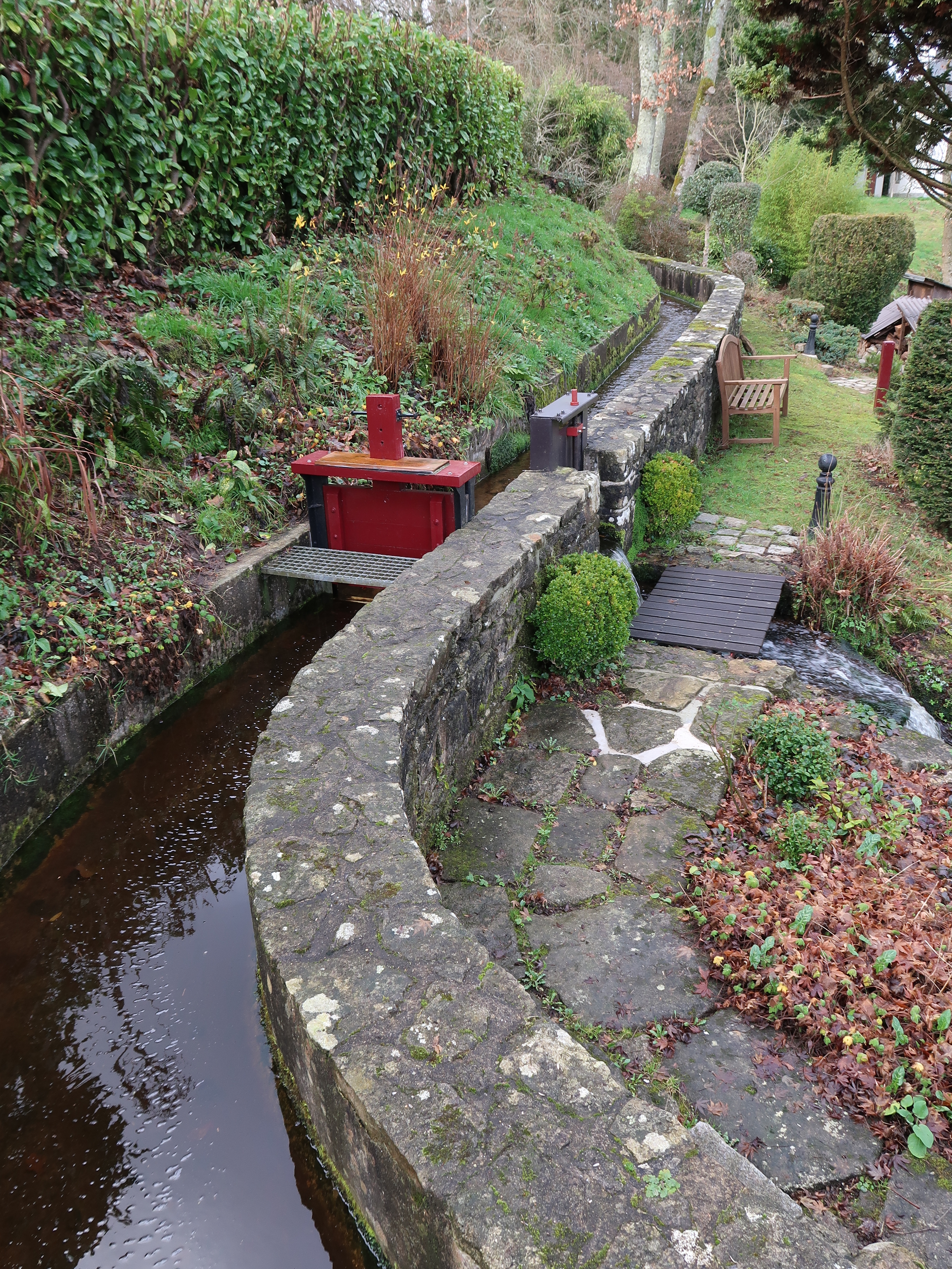 Loguivy-Plougras, le bourg : Moulin à eau de Traou an Dour, rigole du canal d’amenée (vanne permettant de réguler ou fermer l'alimentation en eau)Immatriculation