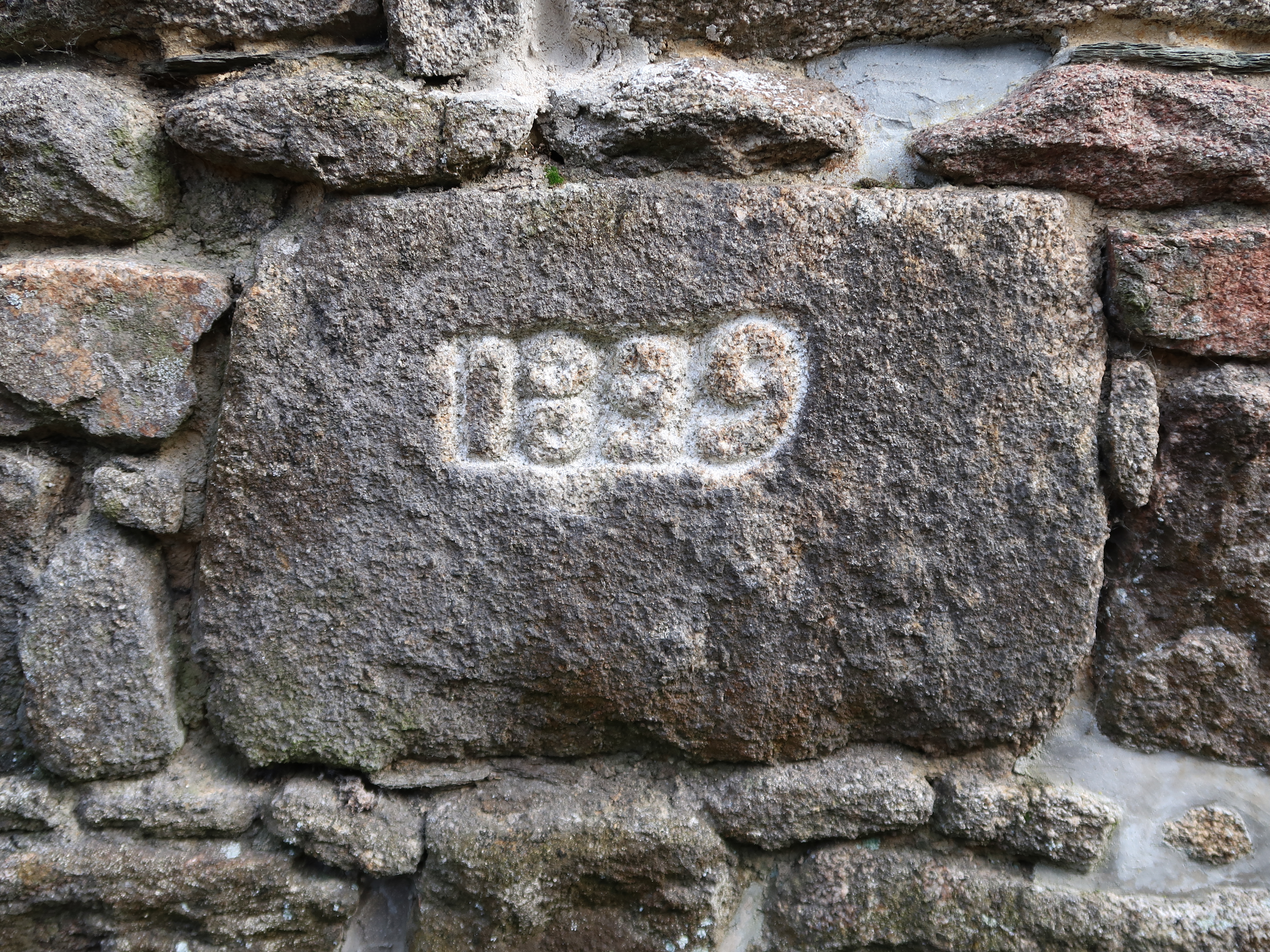 Loguivy-Plougras, le bourg : Moulin à eau de Traou an Dour, élévation ouest, détail d'une pierre portant le millésime "1839"Immatriculation