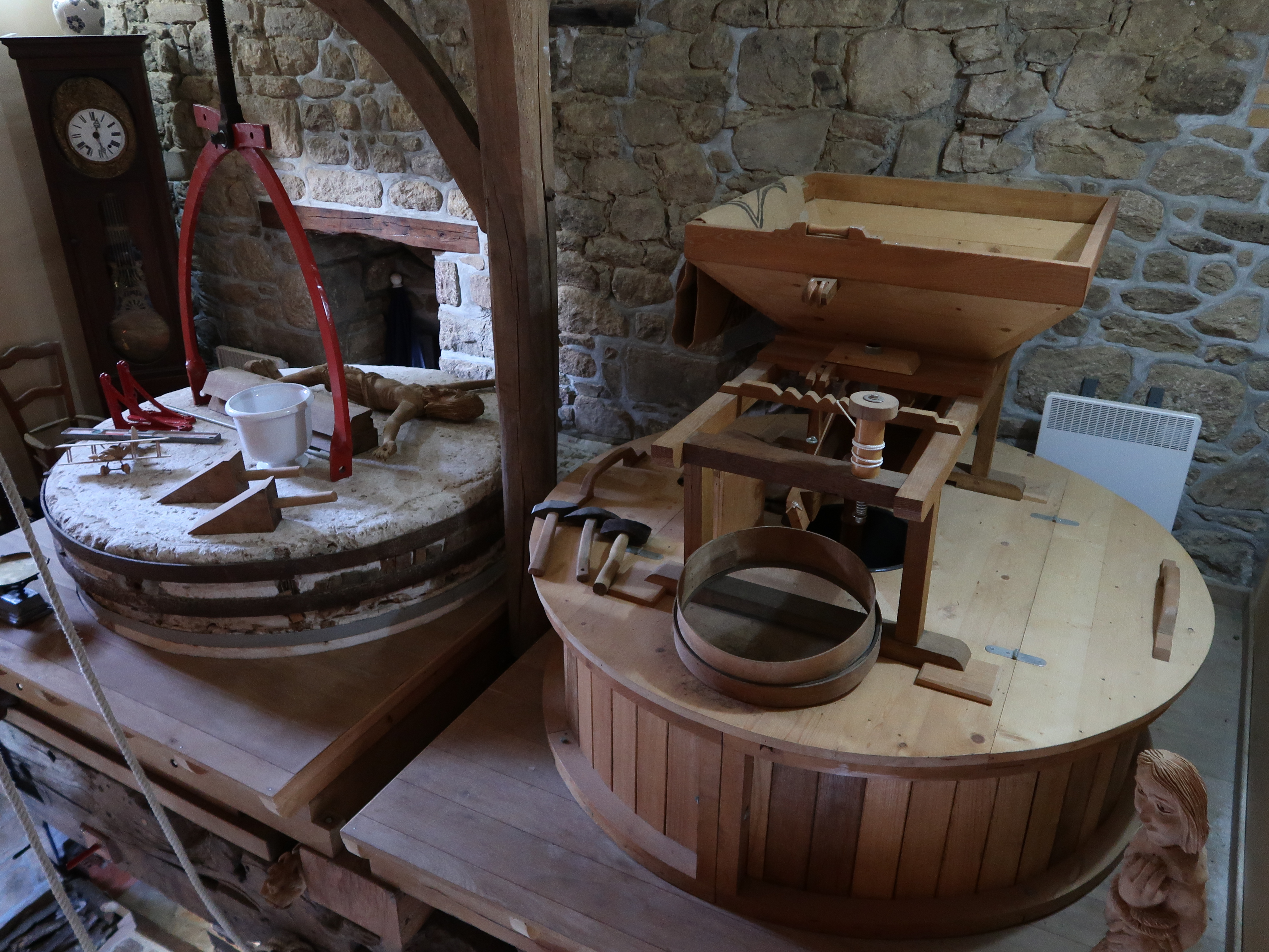 Loguivy-Plougras, le bourg : Moulin à eau de Traou an Dour, détail des deux meules sur la plate-forme (trémie et archures restaurées à l'identique)Immatriculation