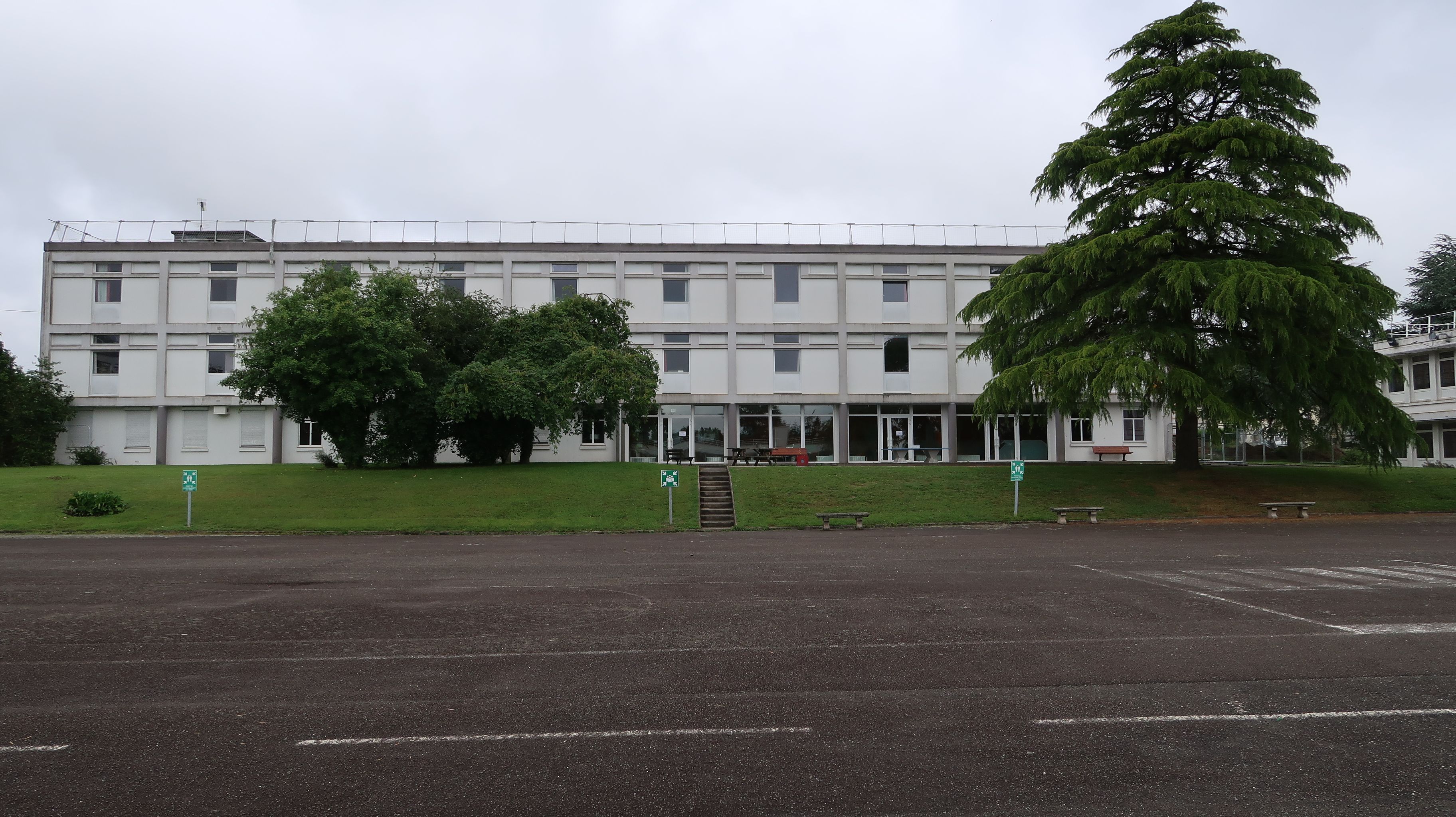 Façade est du bâtiment E (internat de garçons et salles de classe). Au premier plan, la vaste cour. Au rez-de-chaussée, le foyer ouvre sur une terrasse aménagée (tables de ping-pong, bancs...).Immatriculation