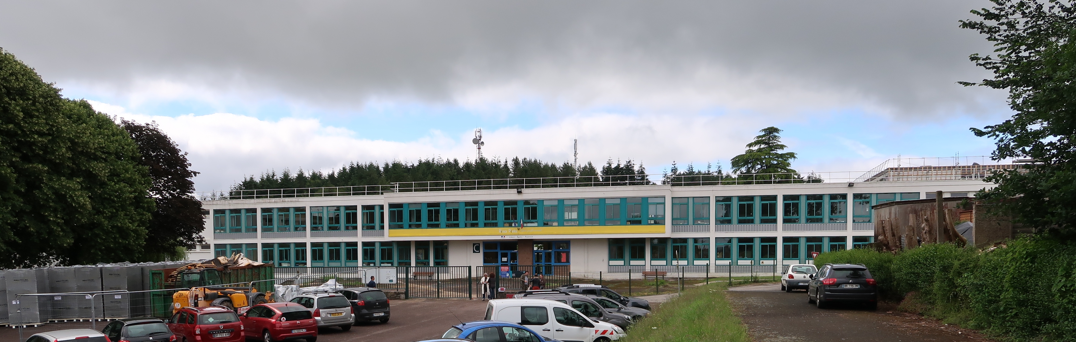 Bâtiment C (externat), façade nord. Prévu pour être la "cour des garçons", l'espace au premier plan est désormais un parking municipal.Immatriculation