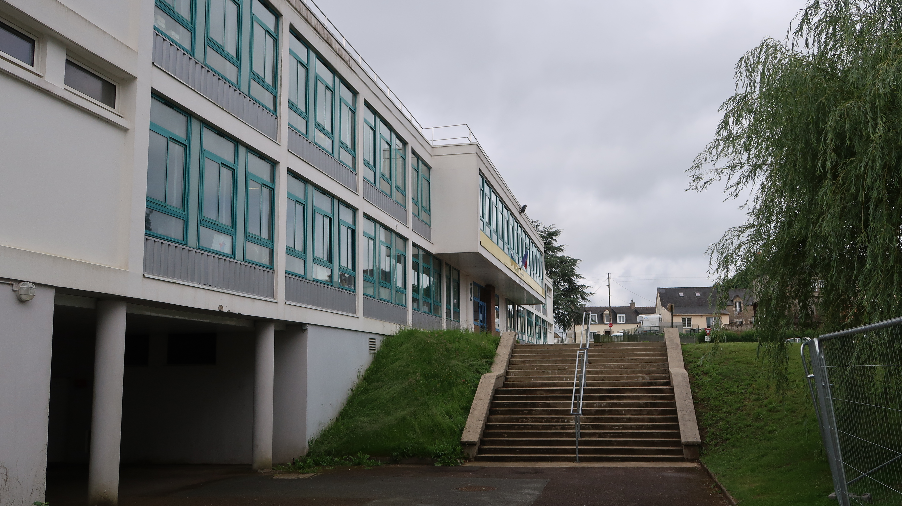 Façade nord du bâtiment C (externat), vue prise de l'est. L'architecte utilise la déclivité pour créer un préau traversant, donnant accès au réfectoire et à la cour..Immatriculation