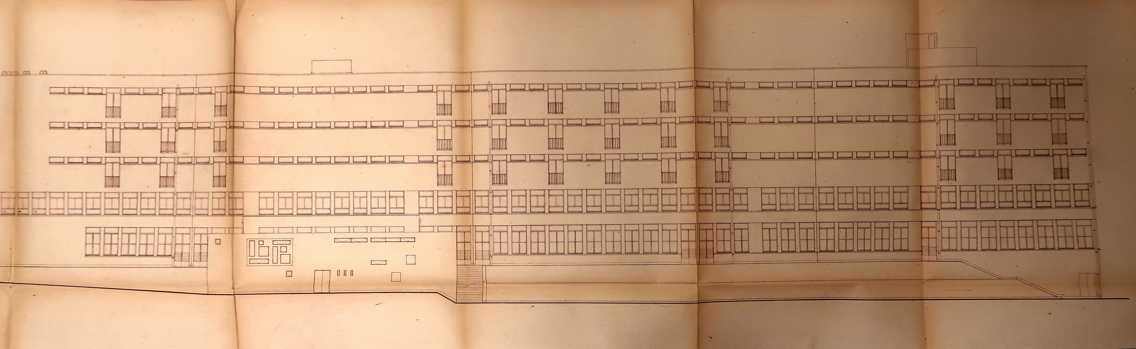 Internat - Bâtiment A. Façade est. Yves Moignet, architecte, 1960.Immatriculation