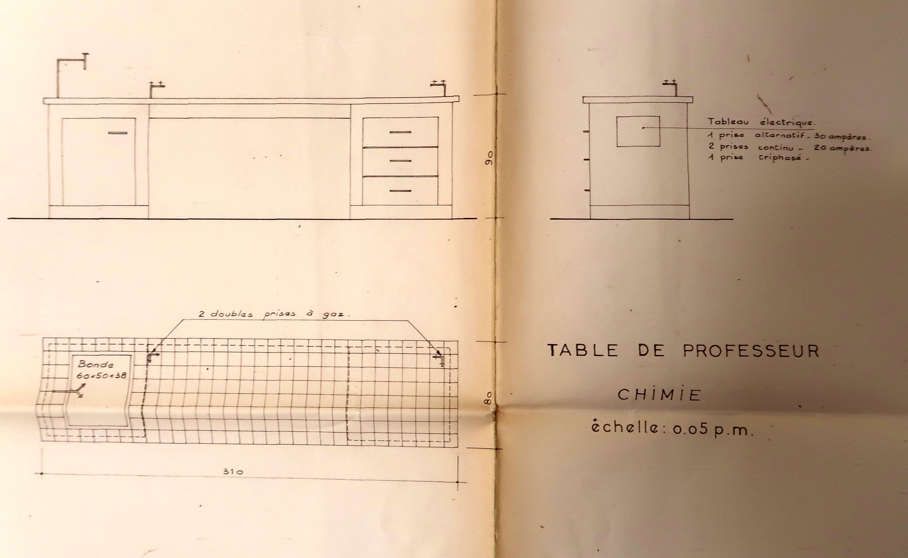 Externat- Bâtiment C. Rez-de-chaussée. Classes de chimie et de physique : détail sur une table de professeur de chimie. Yves Moignet, architecte, 1960.Immatriculation