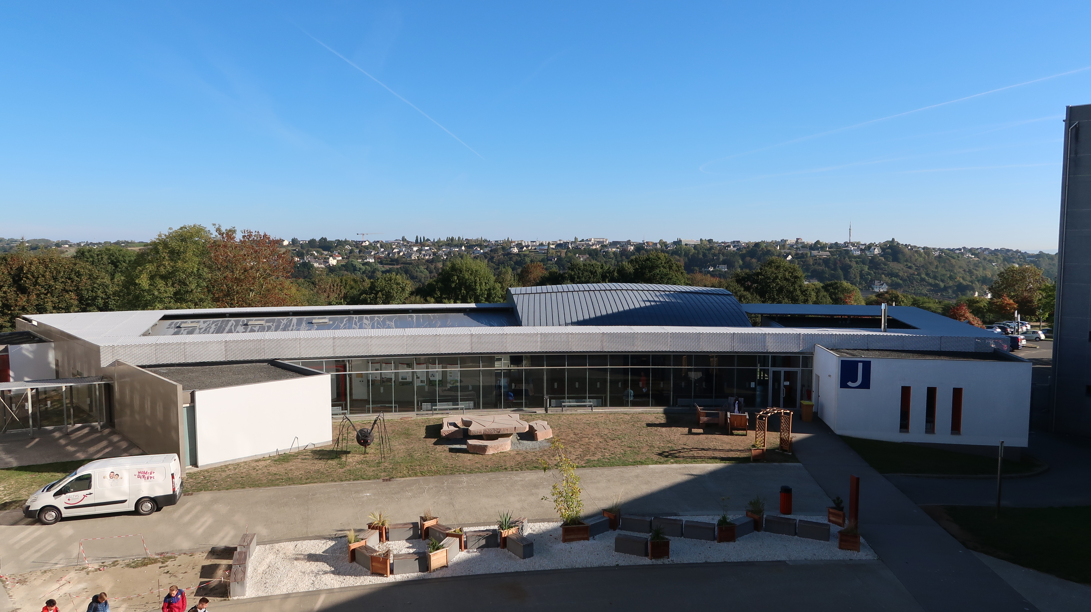 Vue d'ensemble du bâtiment J (CDI, salle des professeurs, amphithéâtre), prise depuis le sud. Thierry Soquet, architecte, 2006.Immatriculation