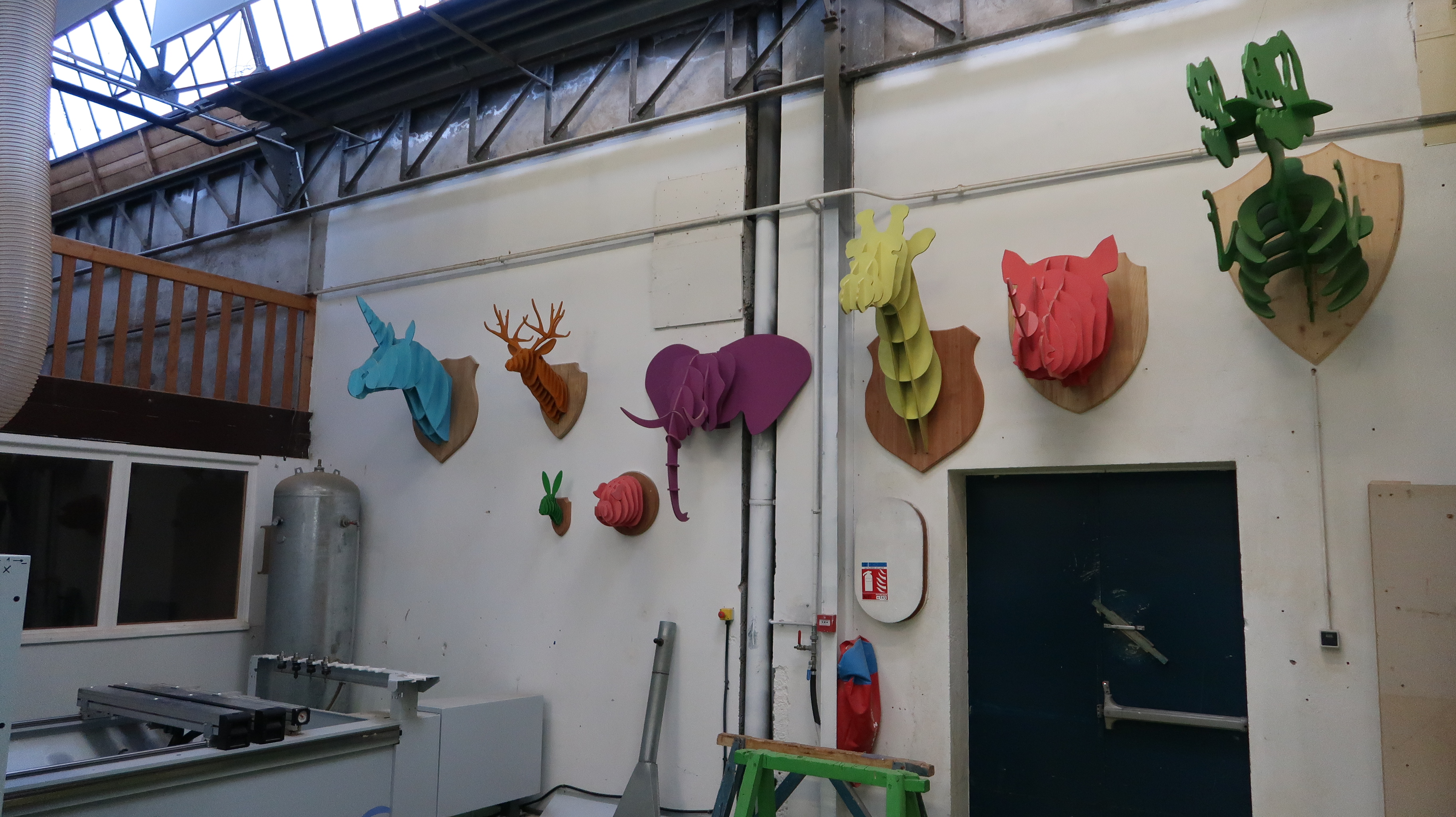 Atelier menuiserie, vue intérieure, réalisations d'élèves.Immatriculation