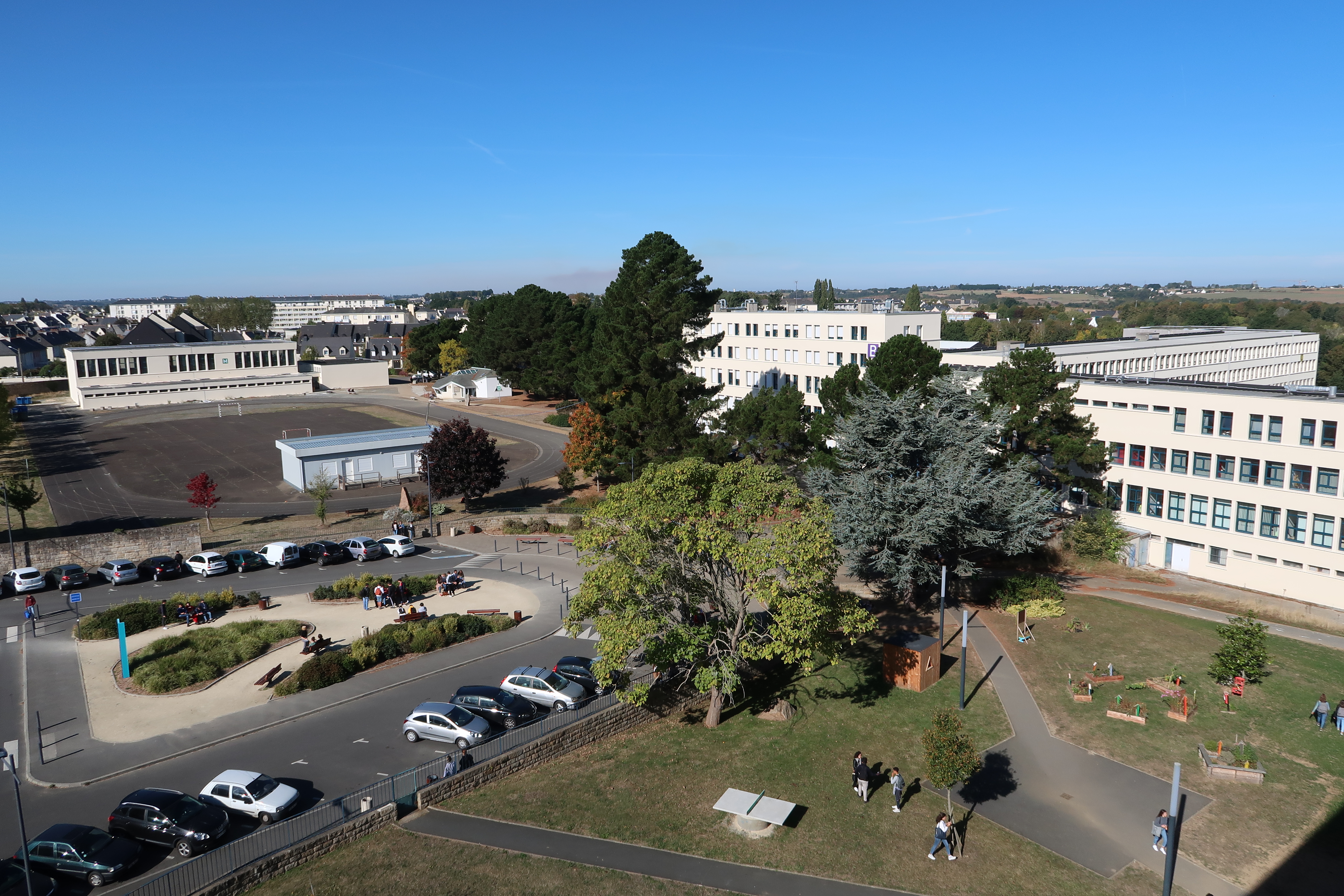 Vue d'ensemble prise depuis le sud-ouest (toit bâtiment A). A l'arrière-plan, à gauche, le gymnase, à droite, le bâtiment B.Immatriculation