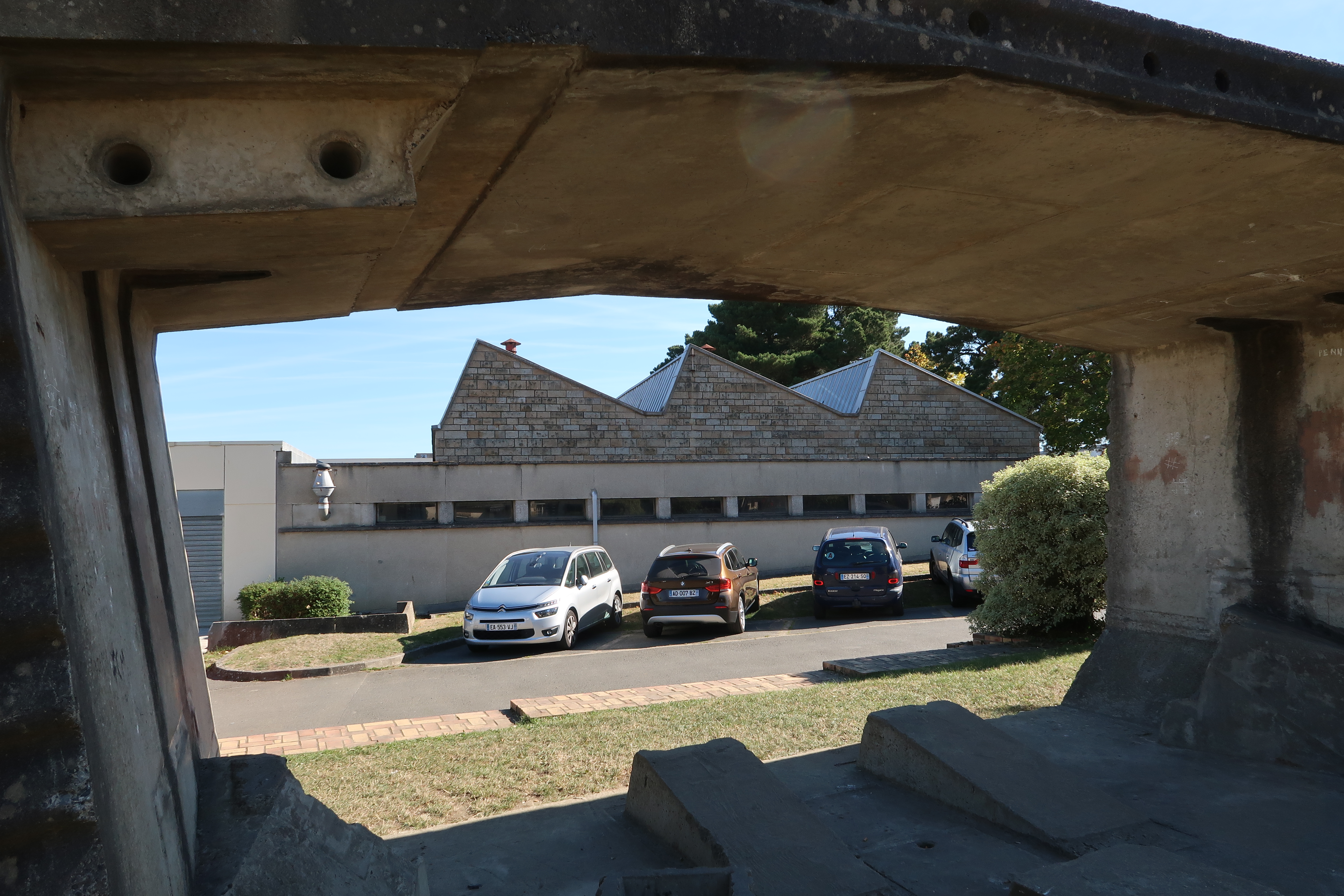 Pignon ouest des ateliers sous sheds (bâtiment F), prise à travers le prototype de voussoir du viaduc du Gouet.Immatriculation
