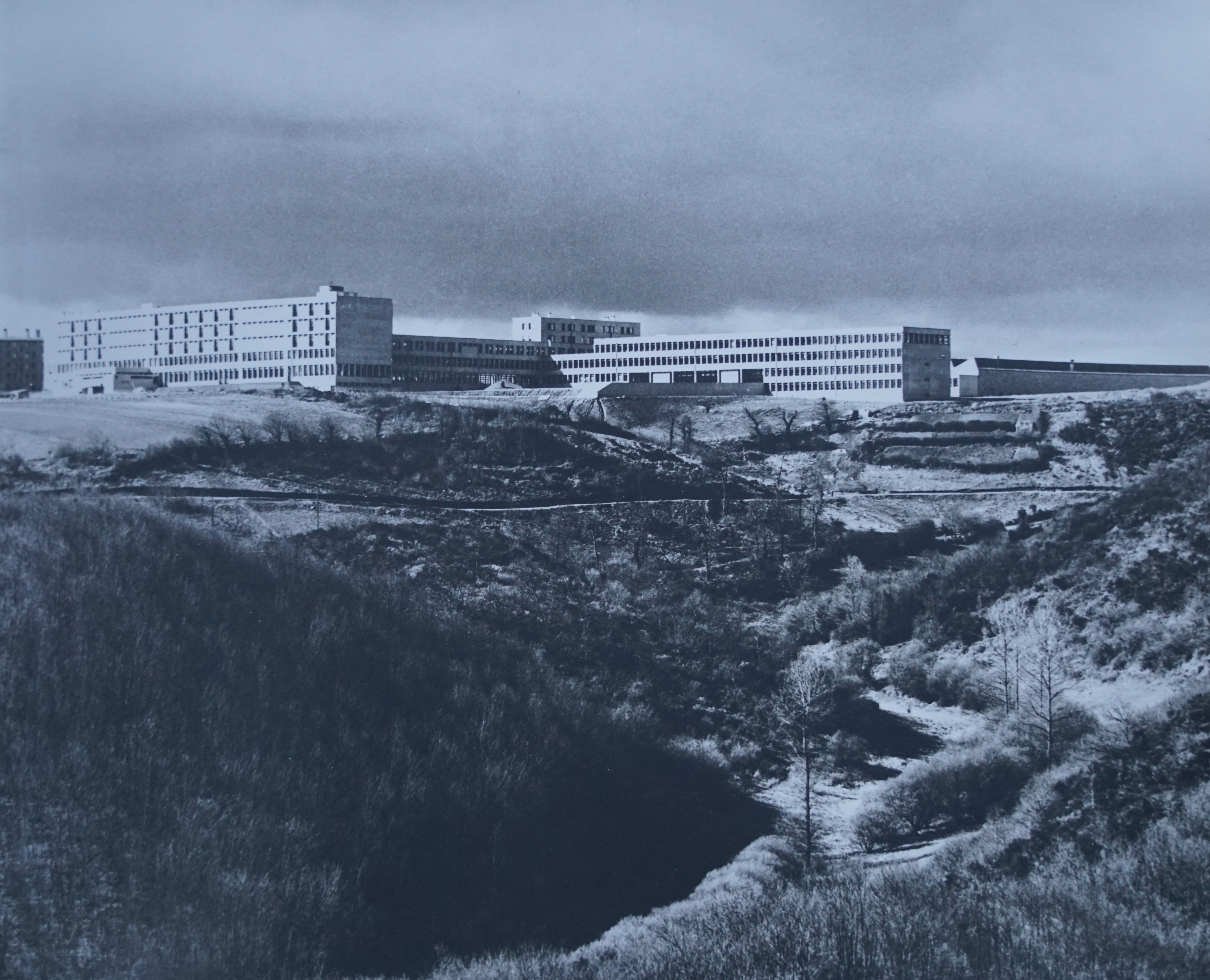 Vue d'ensemble prise par l'architecte Yves Moignet, peu après la construction. Le lycée surplombe la vallée du Gouet, tel l'Alcazar de Tolède (référence donnée par l'architecte).Immatriculation