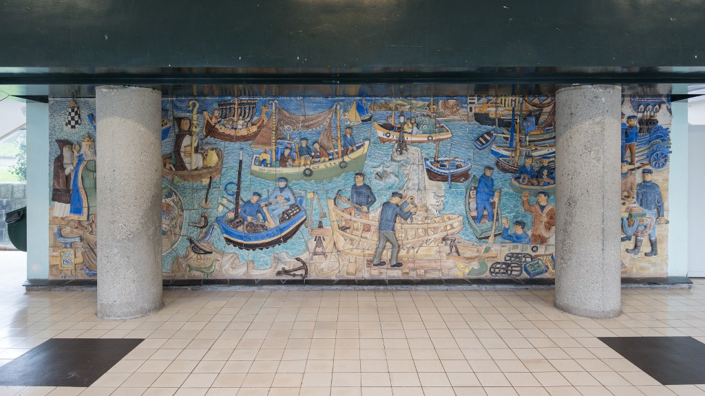 Pierre Toulhoat, "Armor", bas relief en céramique de Quimper (1962). Œuvre du 1% artistique installée dans un foyer de l'internat (D).Immatriculation