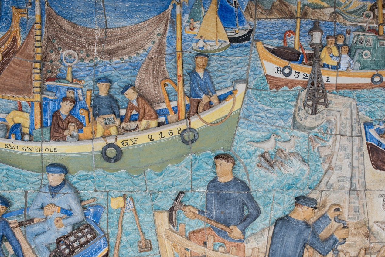 Pierre Toulhoat, "Armor", bas relief en céramique de Quimper (1962). Œuvre du 1% artistique. Détail : scène portuaire.Immatriculation