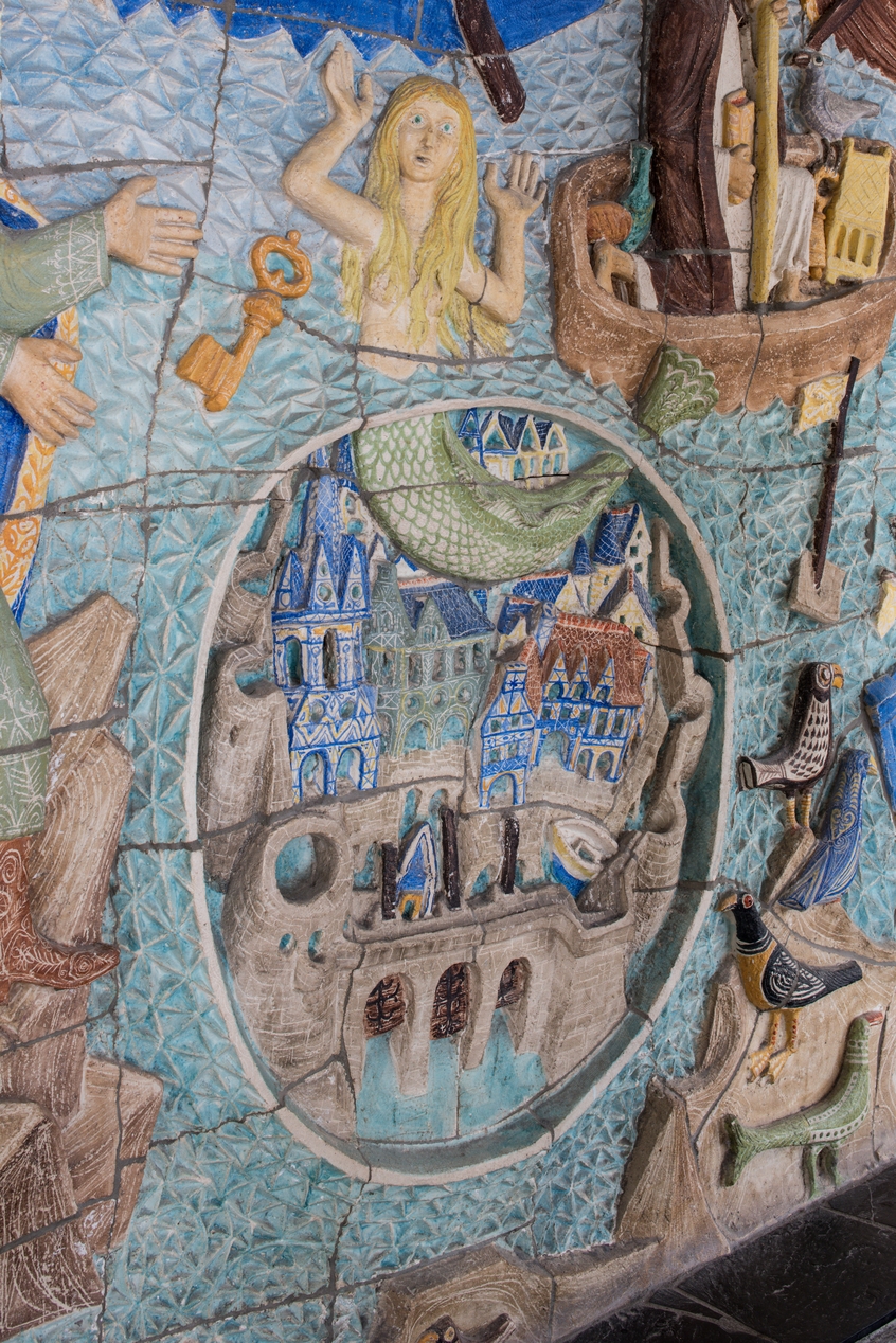 Pierre Toulhoat, "Armor", bas relief en céramique de Quimper (1962). Œuvre du 1% artistique. Détail : la ville d'Ys.Immatriculation