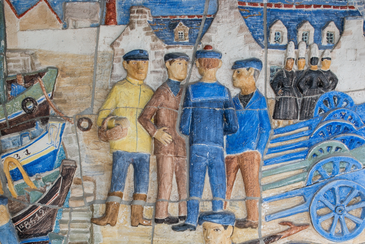 Pierre Toulhoat, "Armor", bas relief en céramique de Quimper (1962). Œuvre du 1% artistique. Détail : scène portuaire, à l’arrière plan, conserverie et ouvrière avec leur coiffe bigoudène.Immatriculation