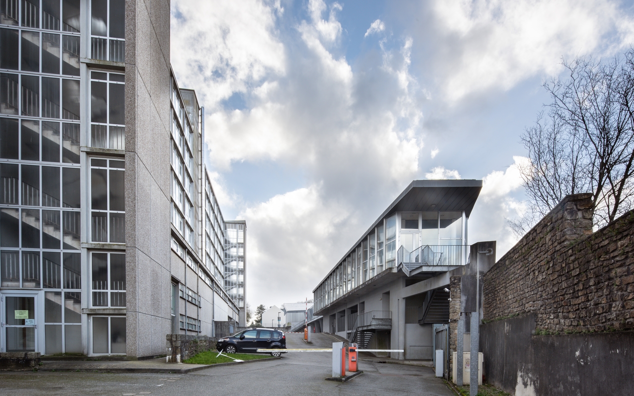 Façade arrière de l'internat (D), 1958, et bâtiment de la restauration (E), 2002. Vue prise du nord-est.Immatriculation