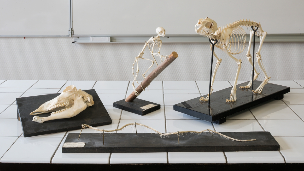 Squelette de ouistiti, squelette de chat, squelette de serpent et demi-crâne de mouton - Zoologie – Embranchement des vertébrés (Comptoir central d'histoire naturelle N. Boubée et Cie.)Immatriculation