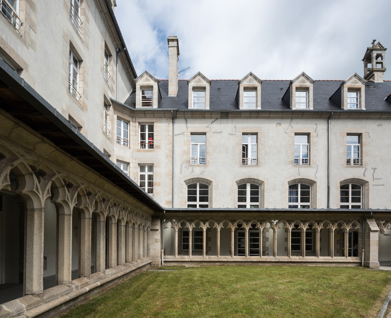 Bâtiments de l'ancien séminaire, angle sud et cloitre des Carmes de Pont-L'Abbé (15e siècle, remonté ici en 1902).Immatriculation