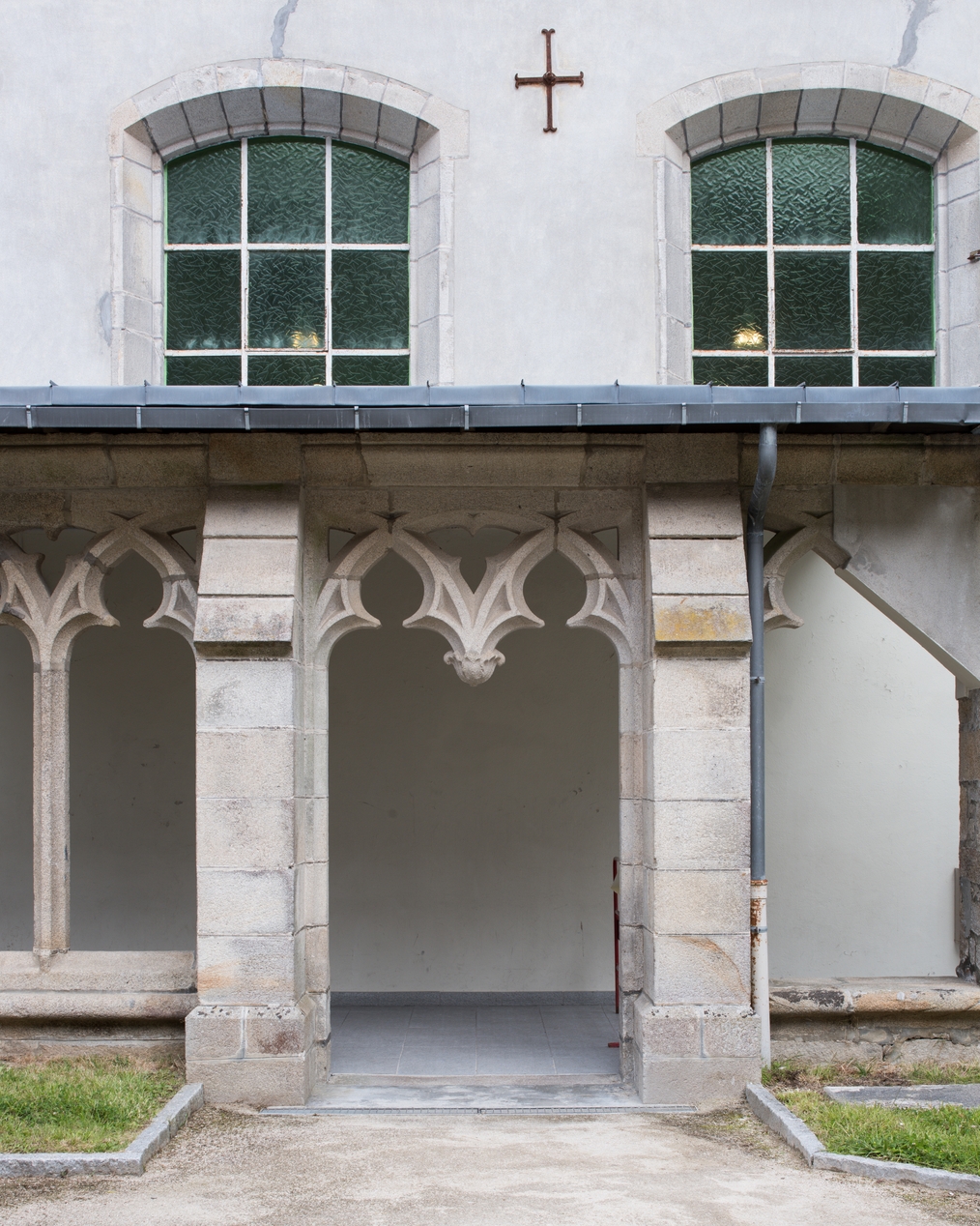 Bâtiments de l'ancien séminaire, détail sur un élément du cloitre des Carmes de Pont-L'Abbé (15e siècle, remonté ici en 1902).Immatriculation