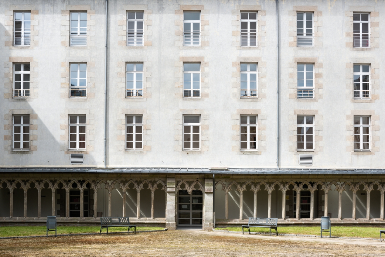 Bâtiments de l'ancien séminaire, détail sur une façade et sur le cloitre des Carmes de Pont-L'Abbé (15e siècle), remonté ici en 1902.Immatriculation