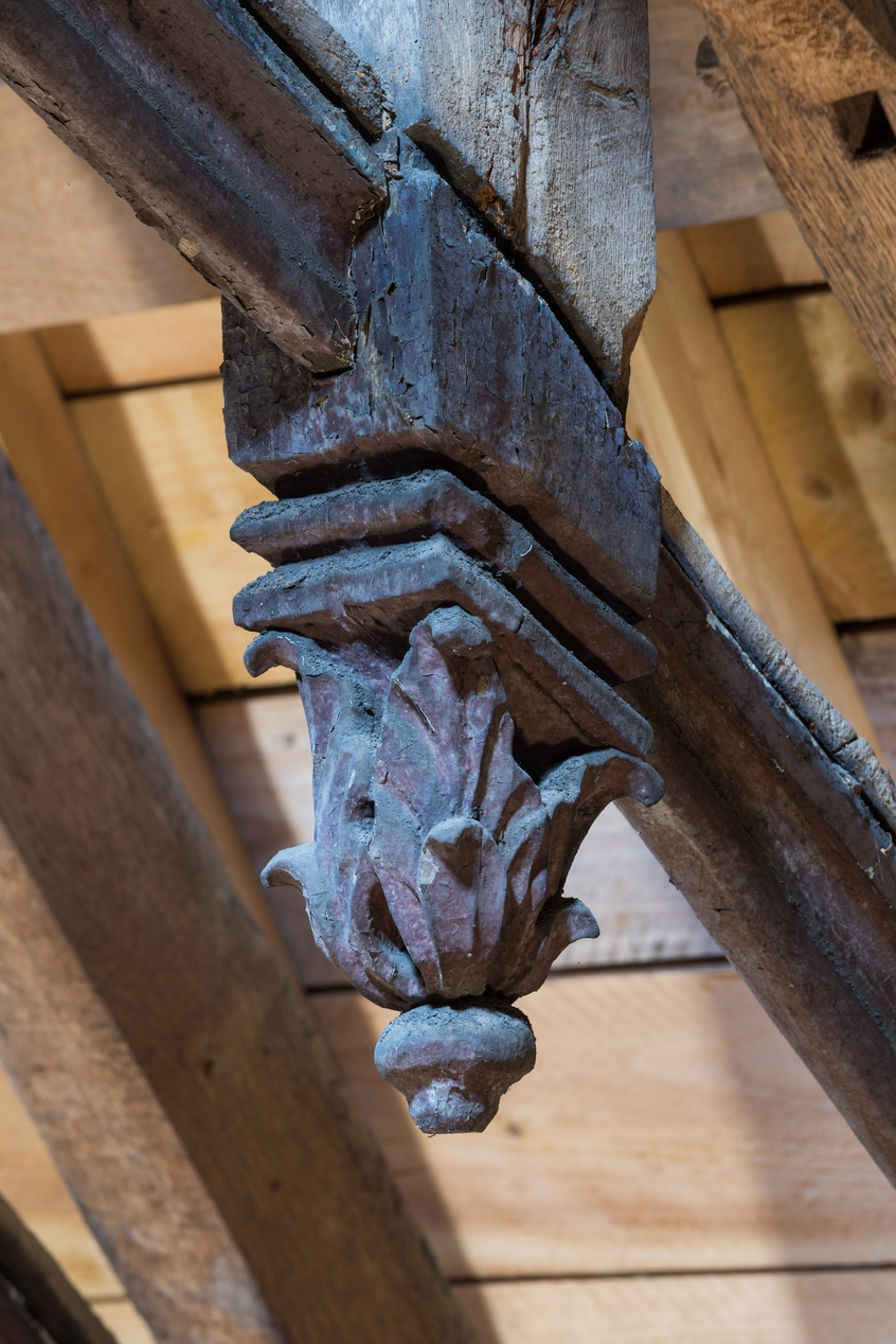 Charpente sculptée de la chapelle (1663) : détail.Immatriculation