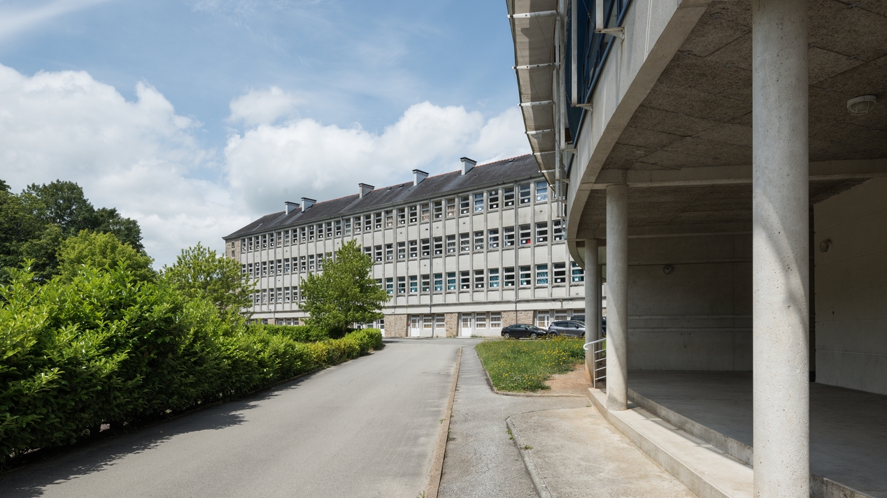Externat, façade sud. Jacques Lachaud, architecte, 1962. Au premier plan, les pilotis en rez-de-chaussée bas du bâtiment des formations hôtelières (1994).Immatriculation