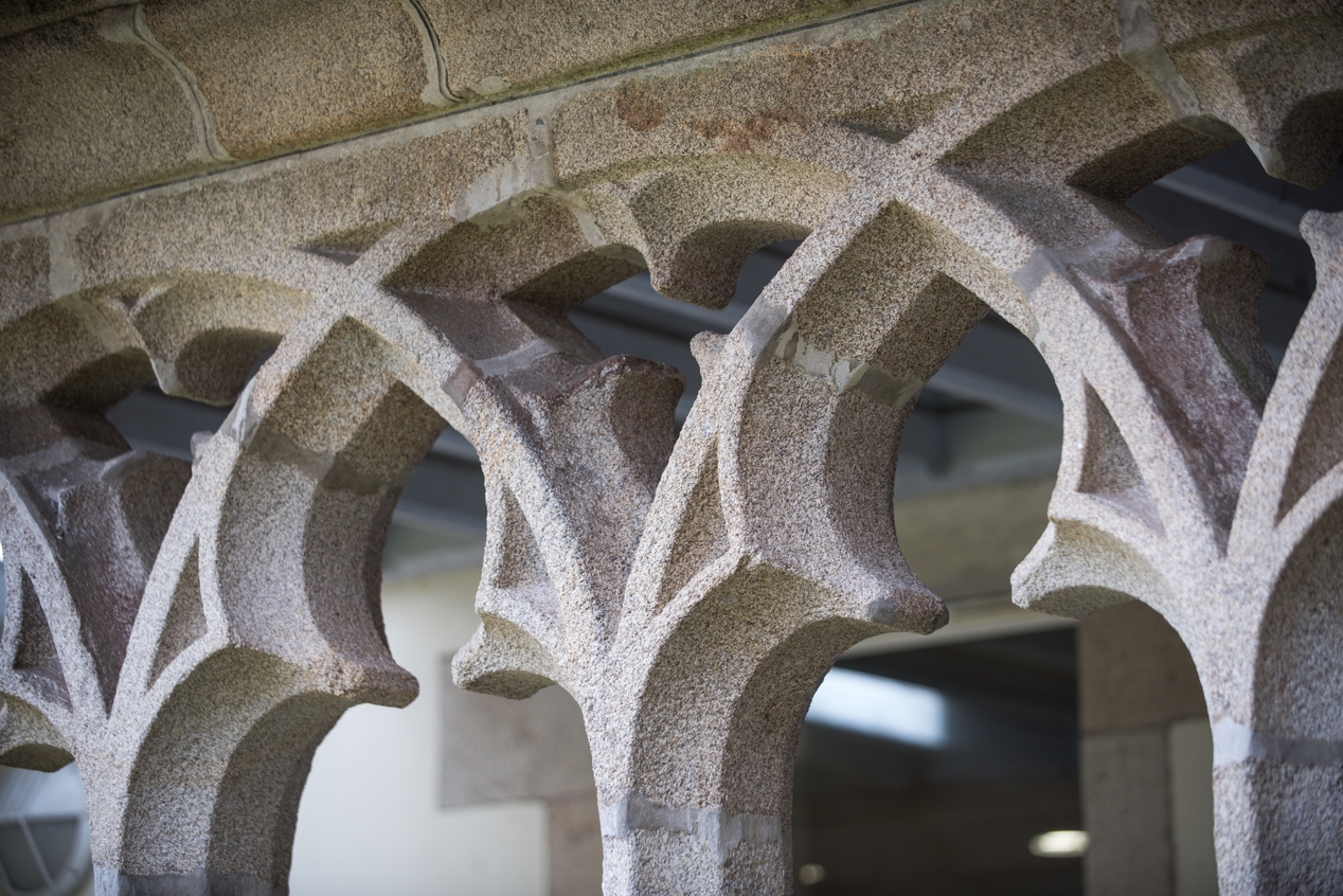 Détail du cloitre de l'ancien séminaire, ancien cloitre des Carmes de Pont-L'Abbé (15e siècle), remonté ici, en 1902.Immatriculation